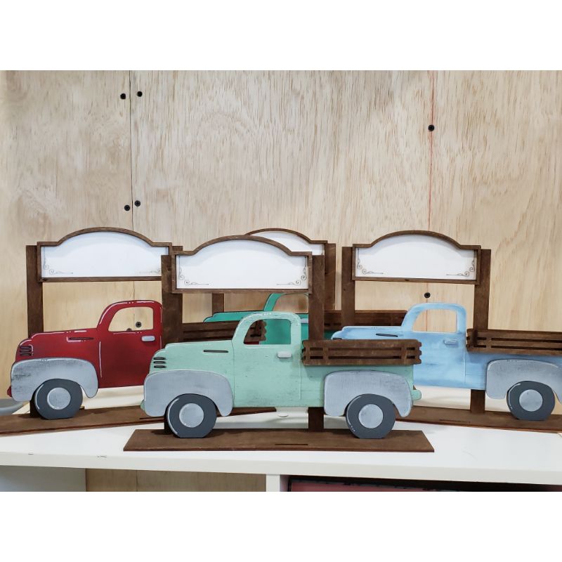 The "Farm Truck Interchangeable - Truck Base and Stand" is the perfect way to add a little farmhouse seasonal cheer to your home décor. This set includes the laser cut Farm Truck, base, tall plaque frame, and hangers for the add-on banners. The Add-On Seasonal sets are sold separately and include the plaque for the tall sign, seasonal items for the truck bed, a banner flag which hangs from the truck bed, and a small standing sign. The truck, tall plaque frame, and small standing sign all fit into slots in the base. Farm Truck Bases are available in a wide range of colors, DIY Kit, and custom colors are available upon request, just specify what color in the comment section at checkout. (Only current DecoArt Americana Acrylic Colors are available for custom products.) Truck base measures 12" long and 2.125" deep, truck measures 11" long and 5" tall, the tall plaque sign measures 8" tall and 6.5" wide.