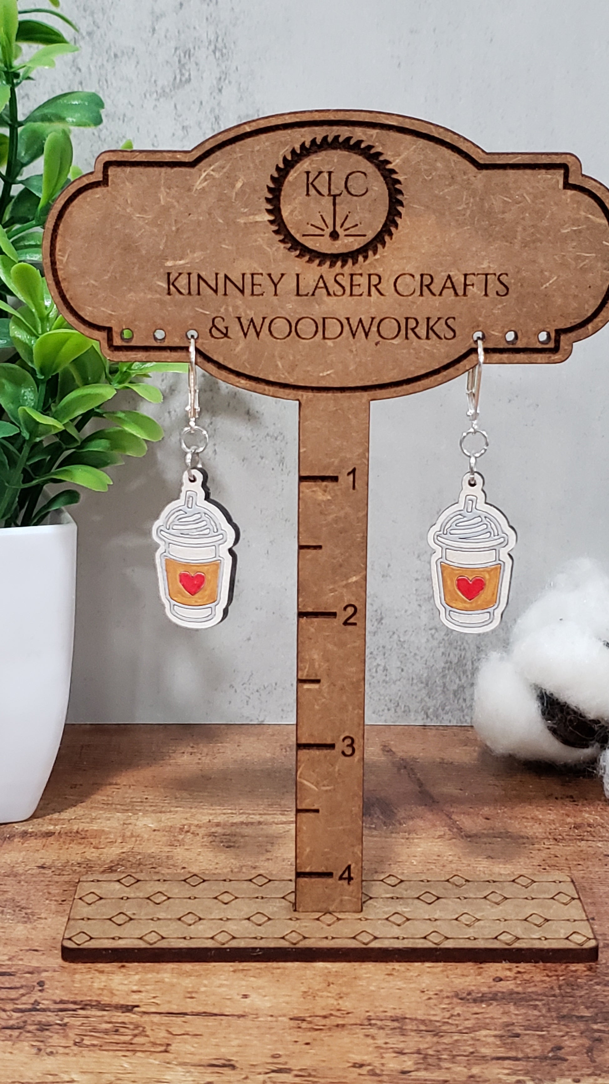Laser Cut Wood Earrings - Coffee Cup - Heart Sleeve - Whip