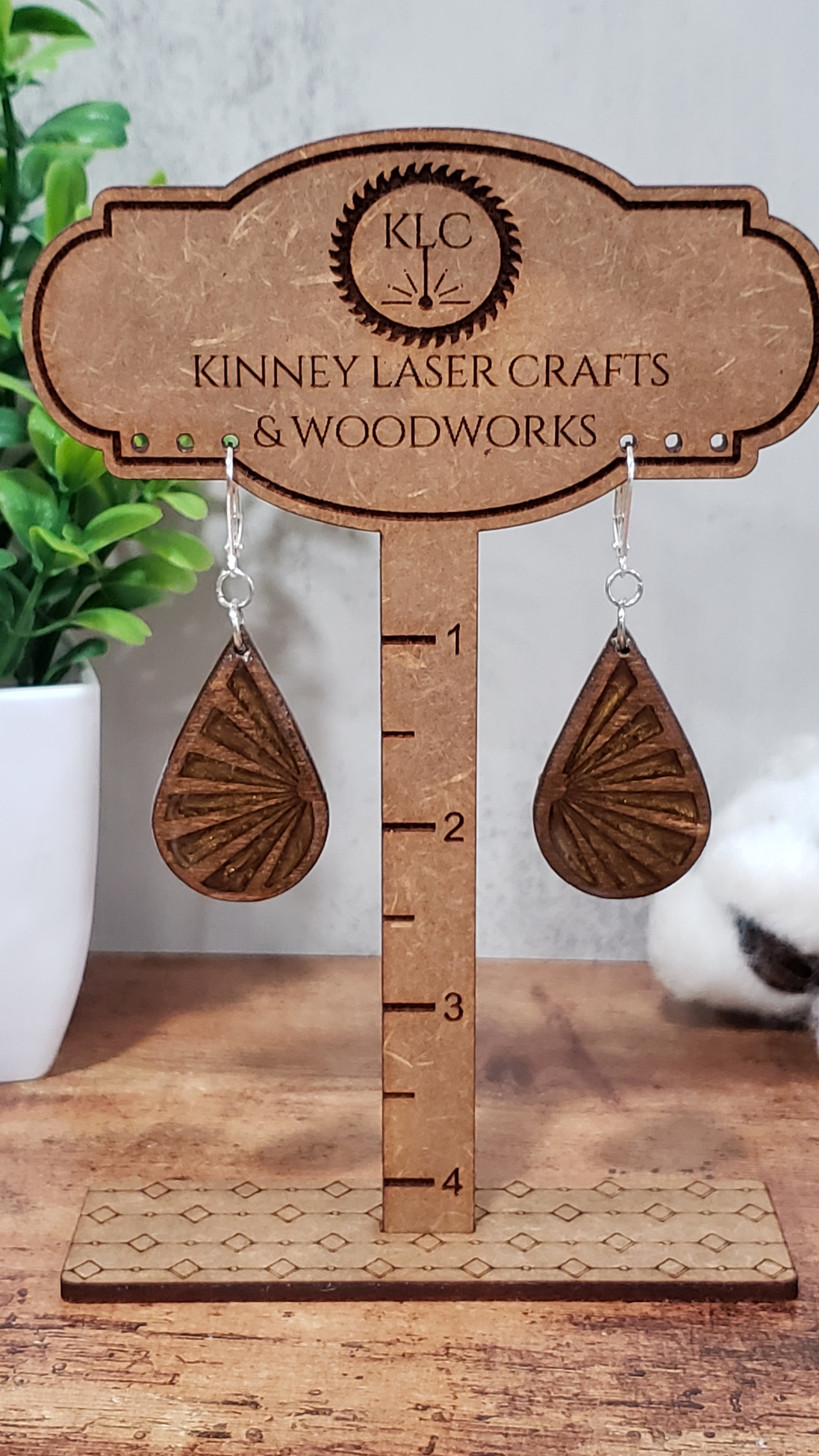 These cute and stylish earrings are laser-cut from wood and MDF, engraved and cut with various designs, then stained or painted and sealed. The resin earrings use flowers, metals, foils, glitter, and other bits and baubles to make one-of-a-kind creations. All earrings use hypoallergenic hardware and are lever-back hooks to secure the earring from falling out like traditional hooks. These earrings are lightweight and durable. The resin coated earrings are water resistant and can be cleaned with a soft cloth and water. The wood earrings are sealed with a matte spray and can be cleaned with a damp cloth.