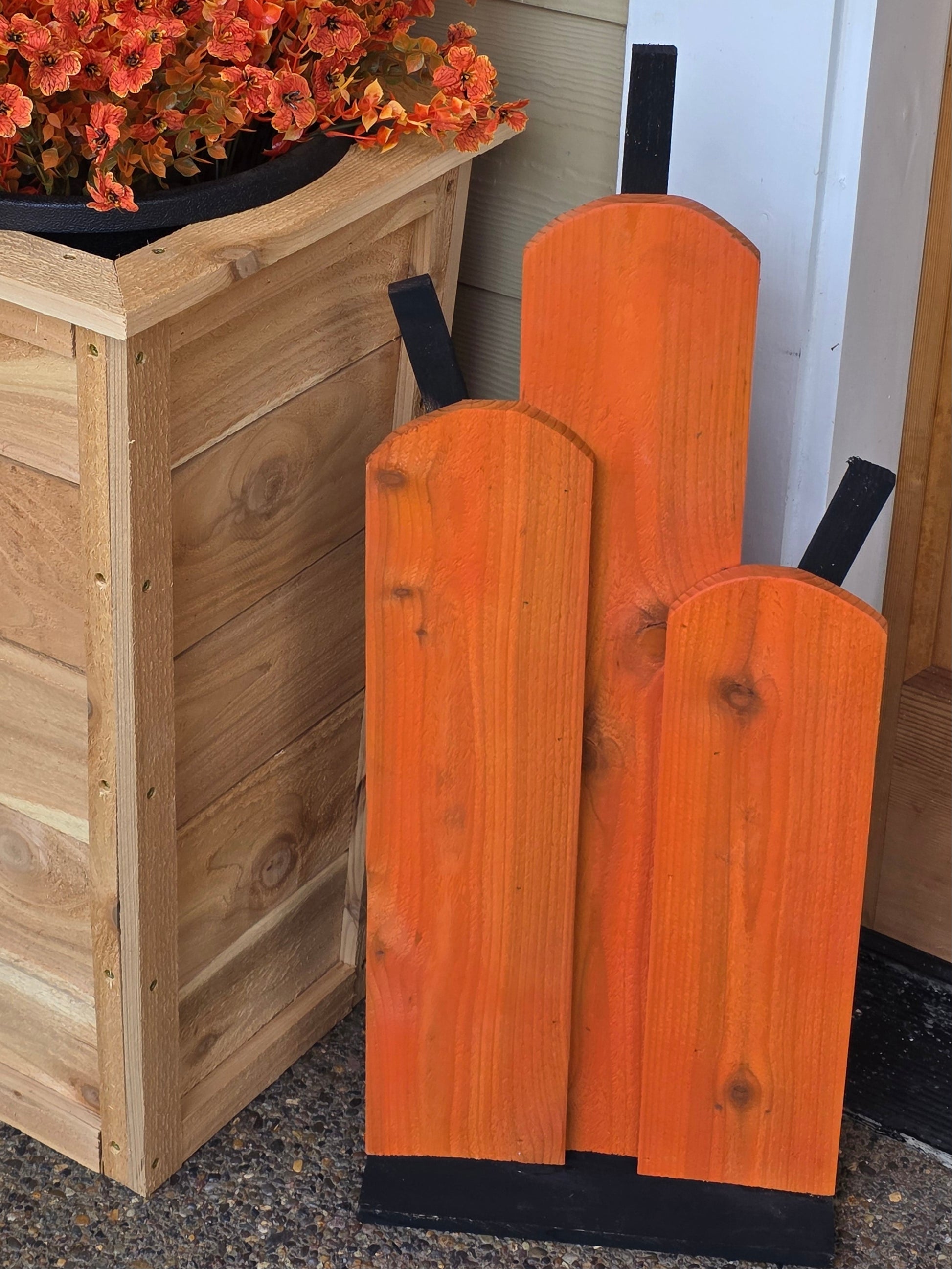 Bring a cozy autumn charm to your porch with these Rustic Pumpkins Porch Sitters. Crafted from cedar and hand painted and assembled, each pumpkin adds a touch of farmhouse whimsy to your fall porch decor. Perfect for welcoming guests or brightening your outdoor space with a playful, rustic vibe that captures the spirit of the season.